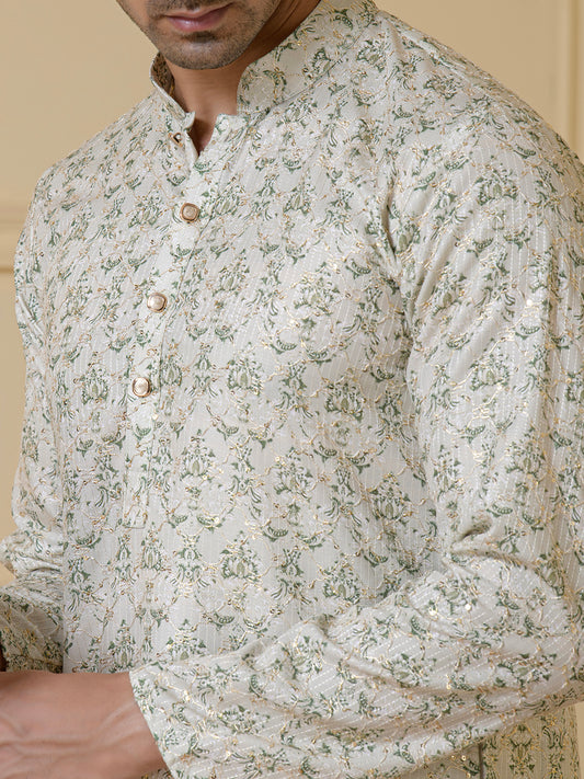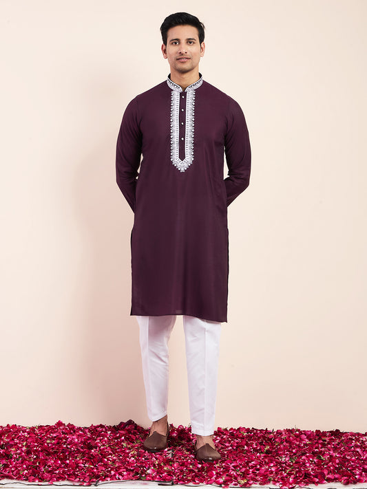 Wine Purple Bird Embroidered Men's Kurta Set with Long Jacket