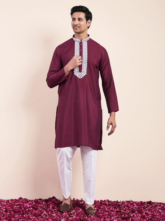 Deep Wine Floral Embroidered Men's Kurta Set with Long Jacket