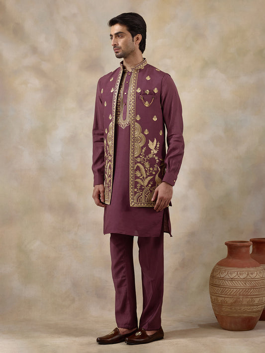 Wine Purple Bird Embroidered Men's Kurta Set with Long Jacket