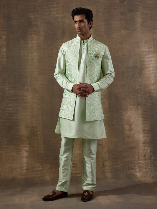 Light Green Geometric Sequinned Men's Kurta Set with Long Jacket