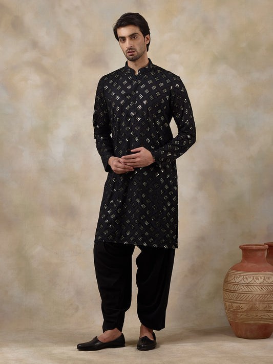 Midnight Black Sequinned Men's Kurta Set with Long Jacket