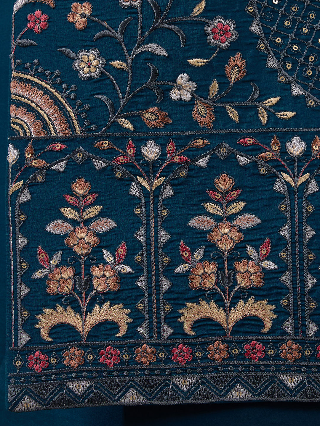 Azure Turquoise Floral Embroidered Men's Kurta Set with Long Jacket