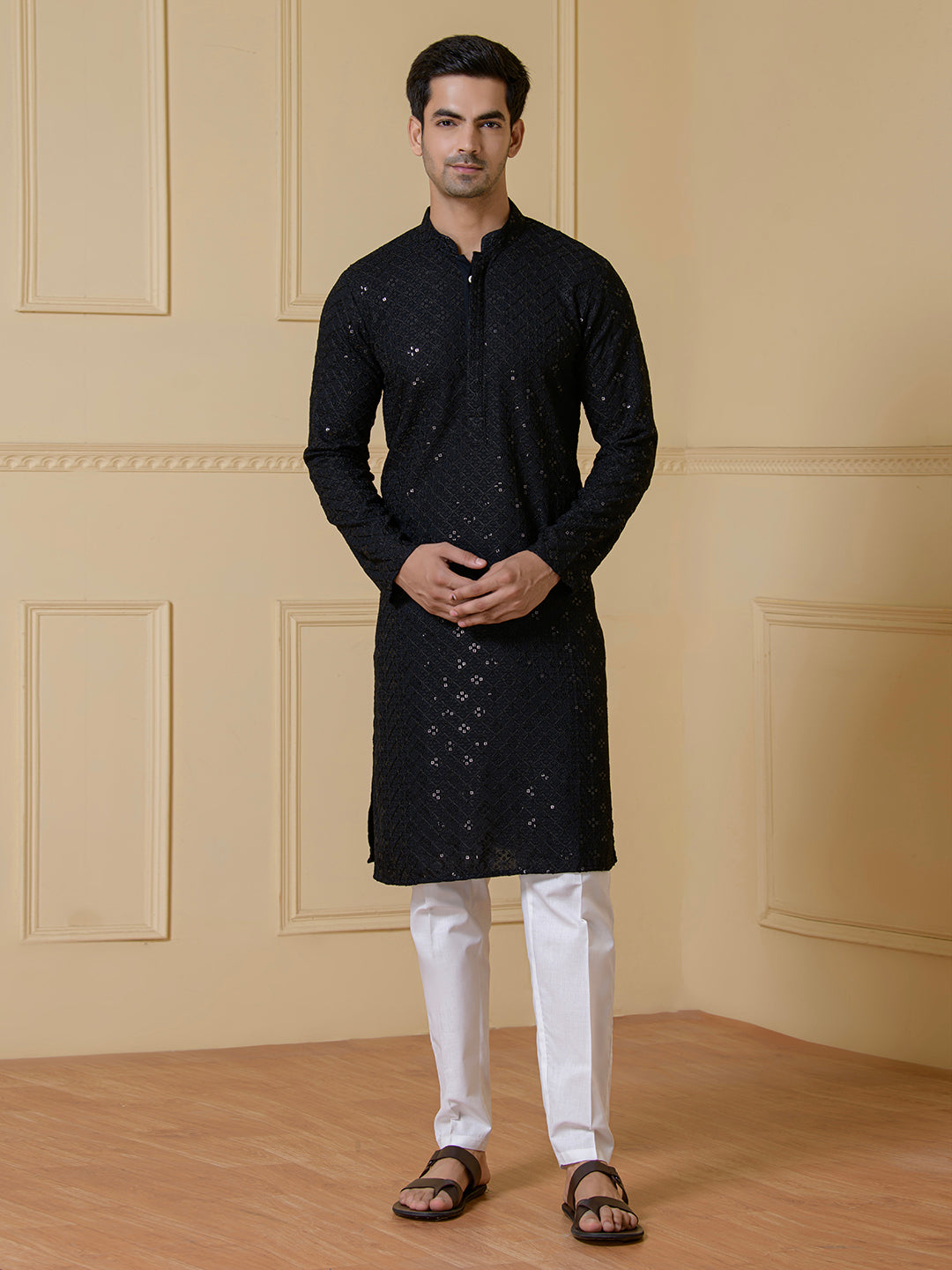 Step into a realm of timeless elegance and intricate craftsmanship with the Midnight Black Chikankari Men’s Kurta from Satwaa. This exquisite piece blends traditional artistry with contemporary style, making it a perfect choice for the discerning modern man.