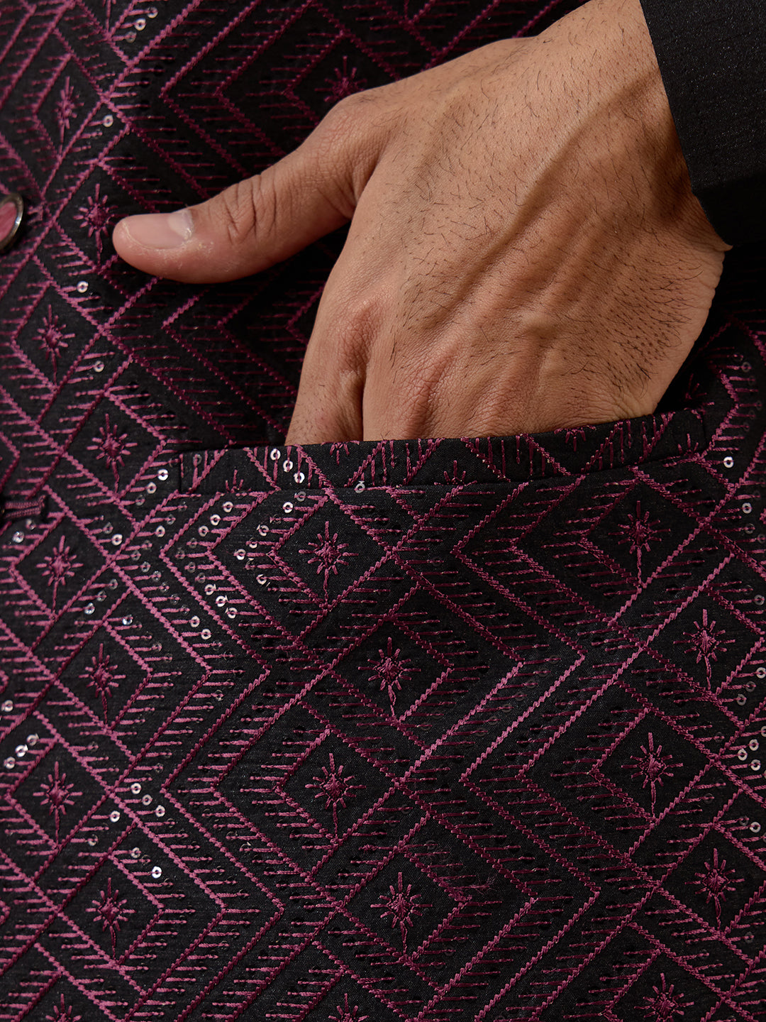 - Ornamentation: Wine nehru jacket with a geometric pattern embellished with sequins and subtle embroidery.